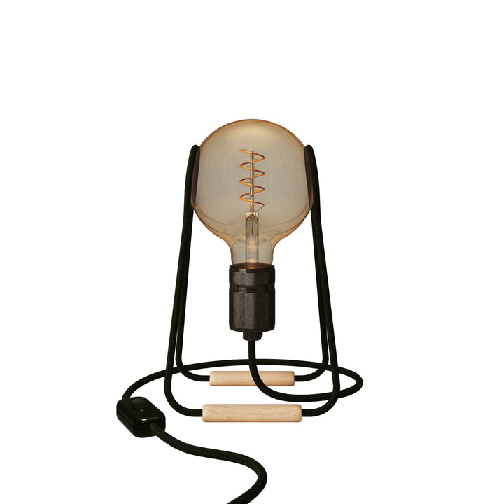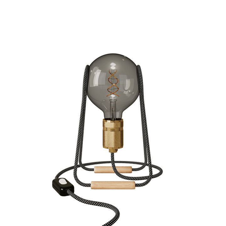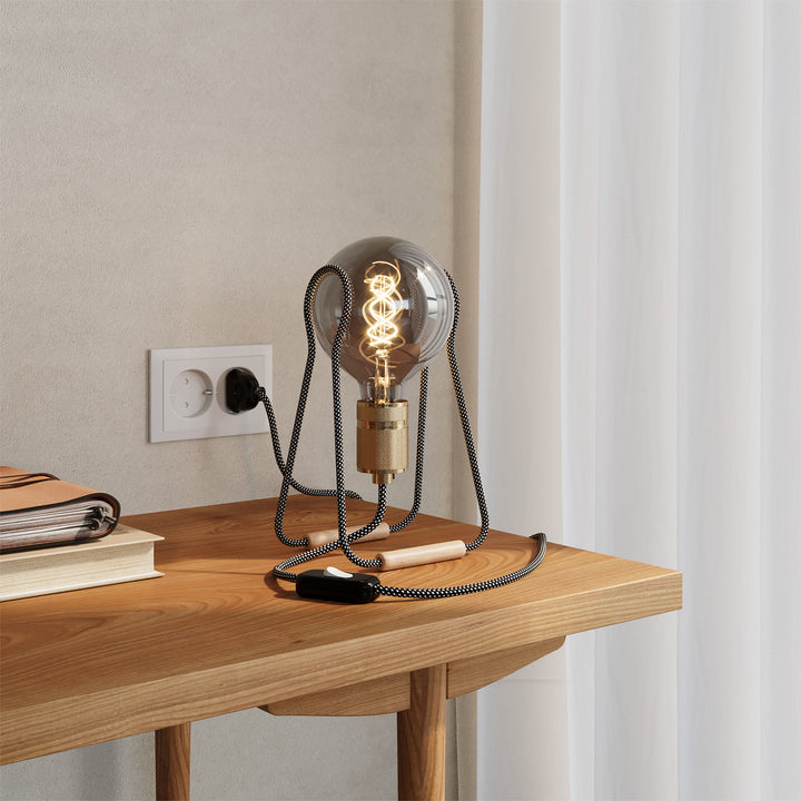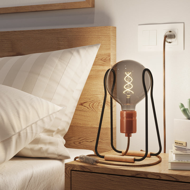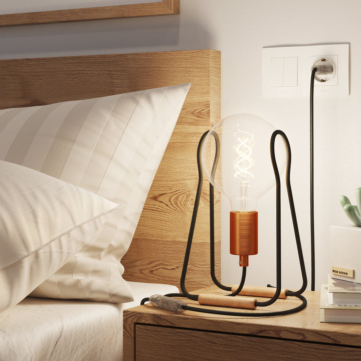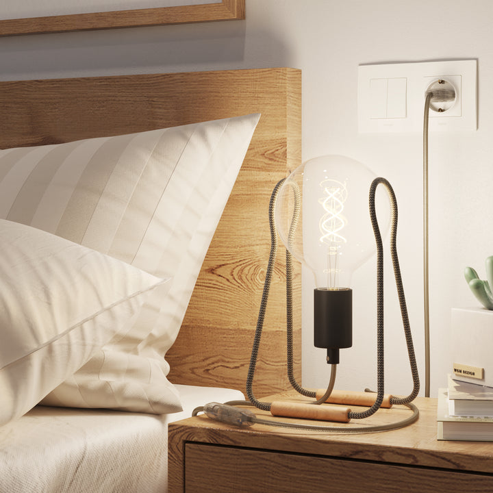 Creativa, moderna e ingeniosa: este es el soporte de lámpara de mesa que surge del encuentro entre Taché: el original soporte para bombillo creado por el diseñador Fabrizio Alessio, y nuestro cableado listo para usar ""Snakebis"". Taché se inspira en uno de los objetos más queridos del mundo del diseño: el clip, patentado por William Middlebrook en 1899, del que recrea la simplicidad y la elegancia. Al igual que los brazos de sujeción de un clip, la construcción superligera de Taché puede sujetar cualquier bombillo globo G125 (ø12.5cm), dejándolo suspendido y expuesto. Taché está compuesto por un marco de alambre recubierto con cable textil y dos pies de madera. Además de tener una función decorativa, protege la superficie del bombillo. Este soporte Taché Metal debes completarlo con nuestro ""Snakebis"" o cableado listo para usar que incluye cable textil, el enchufe y el interruptor, y de tu gusto escoges el portalámparas metálico cilíndrico que más te guste.